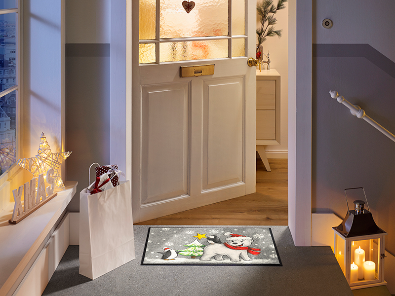 שטיח כניסה מעוצב בהשראת עולם הקוטב, עם איורי חיות חמודות כמו פינגווינים ודובים לבנים, שמכניס לבית אווירה קרירה, רעננה ומלאת קסם.