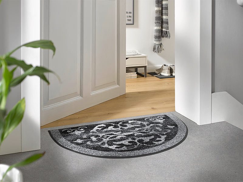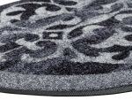 שטיח כניסה בעיצוב עגול ומעודן עם דוגמת קישוטים סימטרית שמוסיפה לחלל תחושת אלגנטיות והרמוניה.