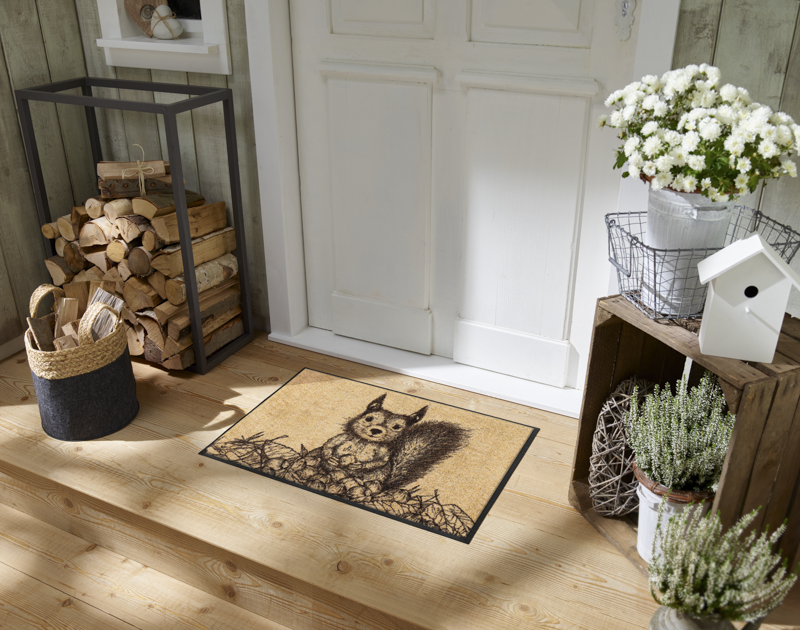 שטיח כניסה מקסים בעיצוב סנאי חום שובב, שמוסיף לבית חמימות, טבע ואופי ייחודי כבר מהצעד הראשון.