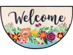 שטיח כניסה חצי עיגול עם כיתוב “Welcome” גדול וברור, על רקע פריחה צבעונית מלאה חיים.